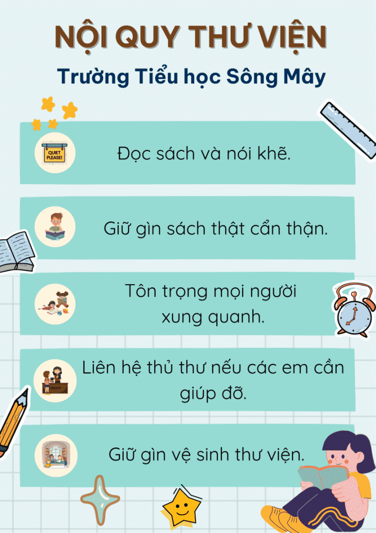 Trong thư viện của trường Tiểu học, mỗi học sinh đều phải giữ cho không gian yên tĩnh, tôn trọng sách và mọi người xung quanh. Việc trả sách đúng hạn và tình thần tự học là vô cùng quan trọng. Các em học sinh sẽ được hòa mình vào thế giới của tri thức, nơi nảy mình giữa những trang sách màu hồng và xanh, mang theo mùi của giấy in và cây viết mới mỗi khi bước chân vào.